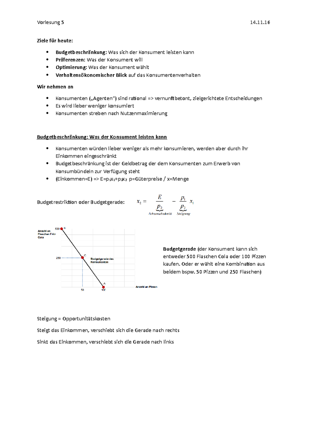 Budgetgerade (der Konsument kann sich entweder 500 Flaschen Cola oder 100 Pizzen kaufen. Oder er wählt eine Kombination aus beidem bspw. 50 Pizzen und 250 Flaschen)
