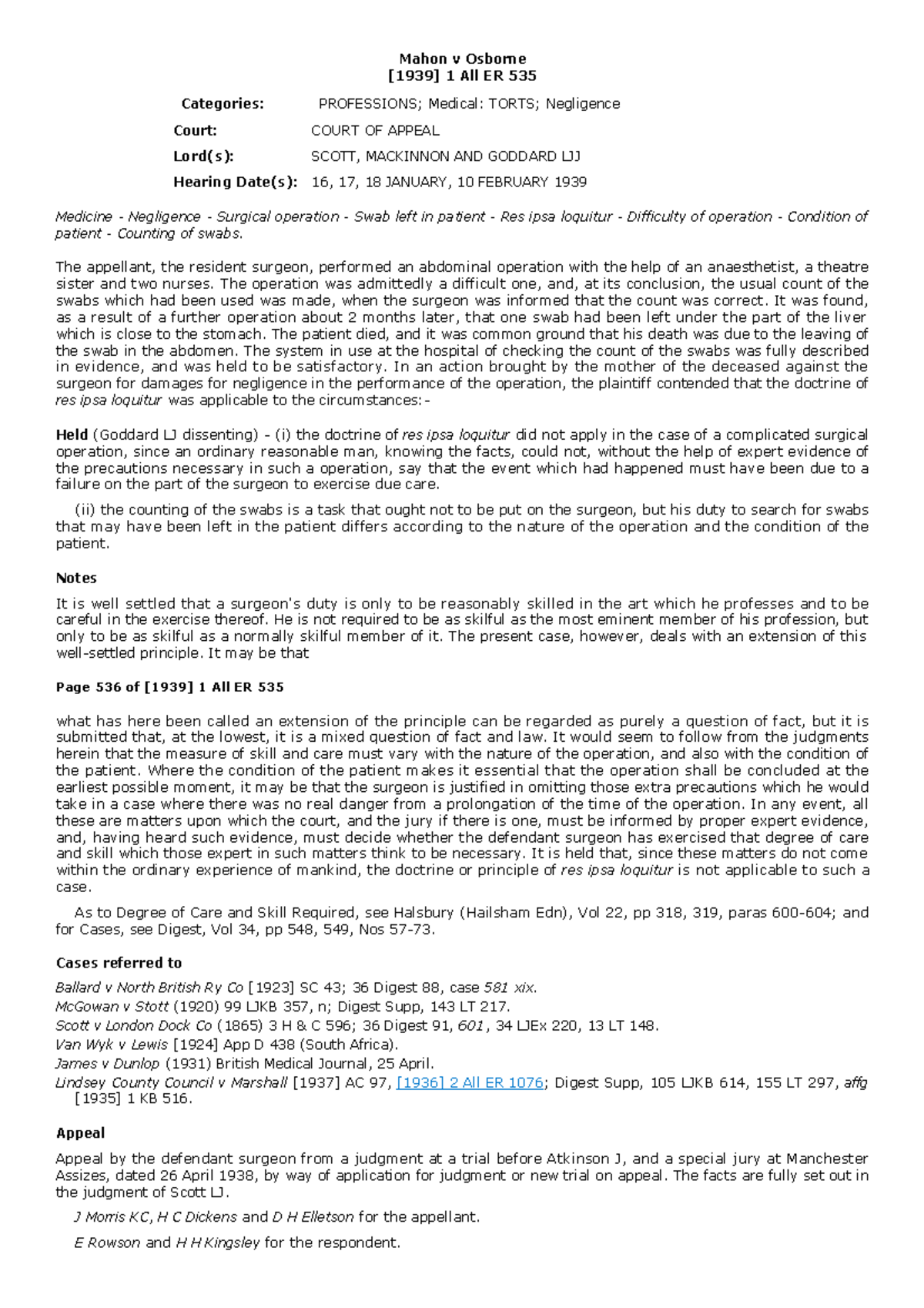 The judge then made three quotations from an English swab case, that of James v Dunlop , in which a jury had found against a defendant surgeon. As the decision laid down no new rule of law, but turned solely on its particular facts, it was never reported in any regular law reports, but an abbreviated note in the British Medical Journal on 25 April 1931, of the hearing of the appeal in the Court of Appeal was supplied to the judge during the trial. It appeared that the defendant in that case had made an application for a new trial on the sole ground that the verdict